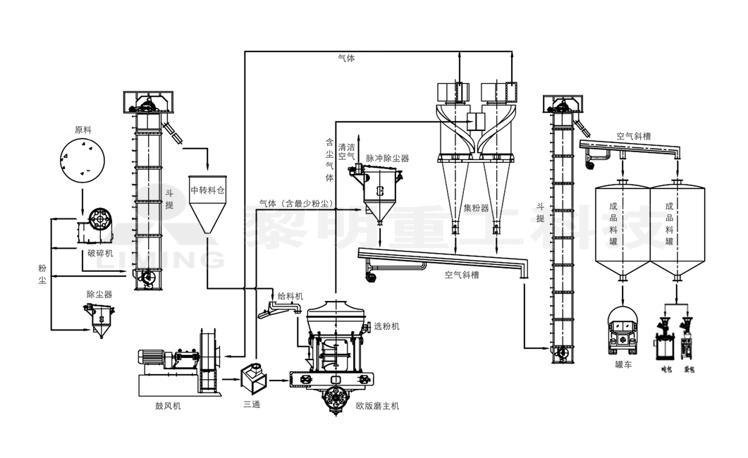 歐版磨粉機作為一種節能裝備,其技術特點是單機生產能力大、易于規模化生產、單位產品能耗低、易于維護等,一次成品細度d97=800~400目(200~38um),單機生產能力依機型不同在6~50T/H,其工藝流程圖見圖.