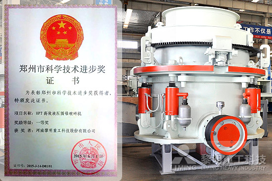 2015年8月,黎明重工HPT液壓圓錐破碎機正式被鄭州市科技局評定為“鄭州市科技進步一等獎”。HPT系列產品通過對層壓破碎、偏心旋轉、全接觸浮動密封、碟簧組變形補償等原理技術的研究,解決了多缸圓錐破普遍存在的潤滑系統密封性差、振動大、效率低、產量低、無過載保護、軋臼壁固定松動等難題。