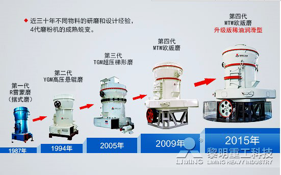 長期以來,雷蒙磨粉機作為重要的工業(yè)磨粉設(shè)備,在市場廣泛的使用。黎明重工自1992年起引進生產(chǎn)這款具備,并積累了豐富的經(jīng)驗。然而,跟隨模仿只能在別人身后亦步亦趨,唯有創(chuàng)新才能成為者。于是,黎明重工敢破敢立大膽創(chuàng)新,從1987年的R型雷蒙磨到1994年的第二代YGM高壓懸輥磨,從2005年的第三代TGM超壓梯形磨,到2009年第四代MTW歐版磨的重磅推出,再到2013年的MTW歐版磨升級版問世,黎明重工在磨粉機上的工藝造詣日臻深厚,不斷完善升級的磨粉機,為礦產(chǎn)品物料的粉磨加工提供更優(yōu)選擇。