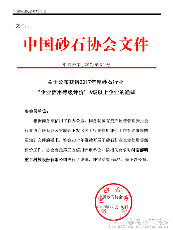 為逐步建立砂石行業信用體系,提升行業內企業的信用管理水平,建立健全行業的工業化發展體制,中國砂石協會特開展砂石行業企業信用等級評價工作。2017年,根據商務部信用工作辦公室、國務院國有資產監督管理委員會行業協會聯系辦公室聯合下發的《關于行業信用評價工作有關事項的通知 》文件要求,在企業自愿申報的基礎上,中國砂石協會本著“公開、公正、科學”的原則,嚴格按照信用等級評價程序,聯同第三方信用評審單位對黎明重工進行了評估,評審結果為AAA。