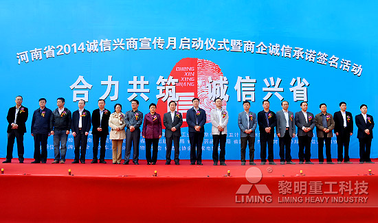 近日,黎明重工受邀參加“河南省2014誠信興商宣傳月”啟動儀式暨商企誠信承諾簽名活動。在河南省各廳局領導、各誠信經營示范單位和誠信企業家代表、新聞媒體記者等現場簽名與誠信宣言的見證下,黎明重工與300余人一起,正式開啟了宣傳月的誠信之旅。